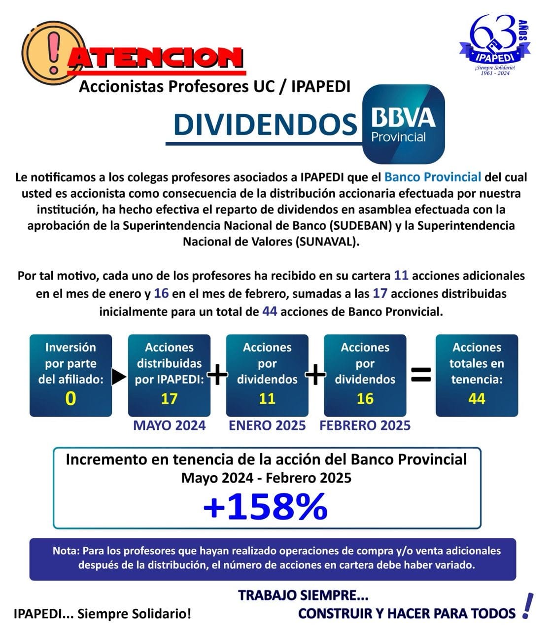 El aviso puesto a circular por IPAPEDI da cuenta de que el Banco Provincial llevó a cabo una ASAMBLEA de accionistas con la autorización de Sudevan y Sunaval, la cual decidió con la autorización de Sudevan y Sunaval, la cual decidió conceder un reparto de dividendos. “Por tal motivo, cada uno de los profesores ha recibido en su cartera 11 acciones adicionales en el mes de enero y 16 en febrero, las que sumadas a las 17 acciones que fueron distribuidas inicialmente da un total de 44 acciones en el Banco Provincial”. Concluyendo que el incremento en “la tenencia de acciones en dicho banco entre incremento en “la tenencia de acciones en dicho banco entre mayo 2024 y febrero 2025 fue de +158%”.