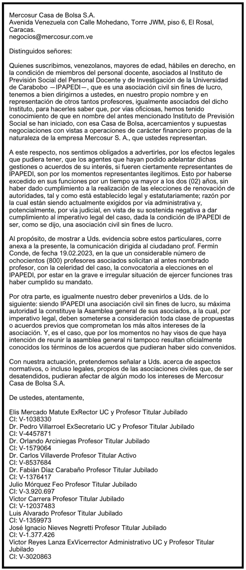 La entrega de hoy la intitulo IPAPEDI: ¡ALERTA ROJA!, y la refiero a una comunicación que el viernes próximo pasado, un grupo de diez (10) profesores UCistas hicimos llegar, vía correo electrónico a la empresa de corretaje de títulos valores denominada Mercosur Casa de Bolsa S. A. En la referida misiva, alertamos acerca del estatus irregular e ilegitimo de quienes usurpan funciones en IPAPEDI habida consideración, que tienen más de dos (2) años con el período vencido y, por consiguiente, sus actuaciones como asociación civil, ante terceros, están viciadas de nulidad.