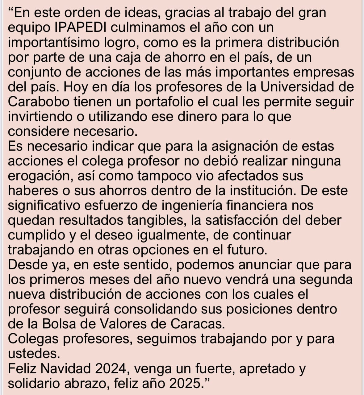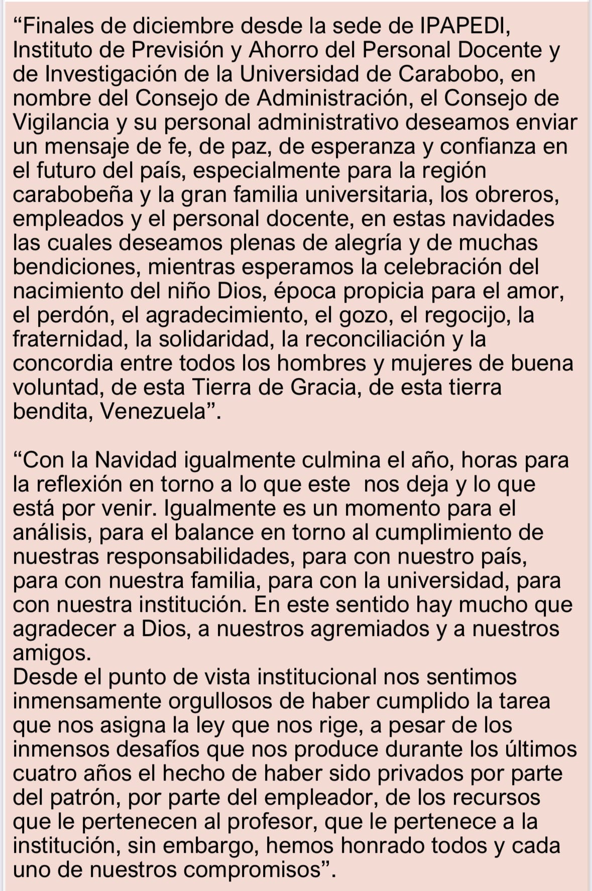 El domingo 22 del corriente, anuncié que la crónica Nº 133 de ese día, cerraba el ciclo de mis artículos de 2024. No obstante, en oportunidades, sobrevienen y se presentan situaciones que obligan a hacer lo que se debe hacer y no lo que se quiere hacer. En efecto, el pasado lunes 23, el ilegítimo actual presidente de IPAPEDI hizo circular por las redes sociales su “Mensaje Navideño 2024”. En el seno del estamento profesoral UCista se generaron diversos y variados comentarios. Un respetado profesor de FaCES escribió: “Que descaro! Es la misma estructura psicológica de NM y DC”. No obstante, me permito transcribir literal y textualmente el referido mensaje a los fines de que sea la conciencia individual de cada profesor(a), la que juzgue la arrogante asechanza espetada por el susodicho.