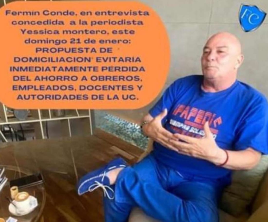Pero la guinda de la torta declarativa la configura la invitación pública que él le hace a la profesora Jessy Divo, rectora magnifica de la UC, a los efectos de que asista a la sede del instituto para enterarla de la domiciliación del ahorro. En la universidad nos preguntamos: ¿por qué Conde no aprovecha su euforia y convoca e invita a una asamblea general extraordinaria de profesores para que explique eso de que la "domiciliación es la acción"?