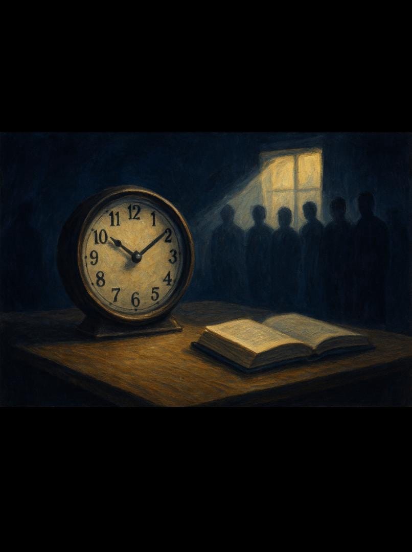 El reloj: cuenta los días de democracia engañosamente suspendida en IPAPEDI, (10 y 10 días), lo que además se aprecia tachonado de oscuridad por una persona opaca, a quien es difícil comprender o conocer completamente debido a su falta de honestidad e integridad en sus relaciones interpersonales. El actual ilegítimo presidente, penosa y lamentablemente, posee ―tal vez― en su perfil psicológico un apreciable déficit de inteligencia emocional (bajo índice de inteligencias intrapersonal e interpersonal).