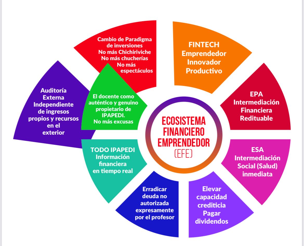 Frente a una realidad de desidia, negligencia y omisión, que hoy colocan en el limbo nuestros ahorros, y que tienen que ver con el desvarío y extravío de una gestión que, sencillamente, llega a su fin; propongo un Ecosistema Financiero Emprendedor cuyo acrónimo se lee EFE. De modo sencillo concebimos que un Ecosistema Financiero Emprendedor (EFE) es el contexto en el que desde Ipapedi de modo proactivo y responsable estimulemos y propulsemos iniciativas y proyectos emanados de la academia UCista.