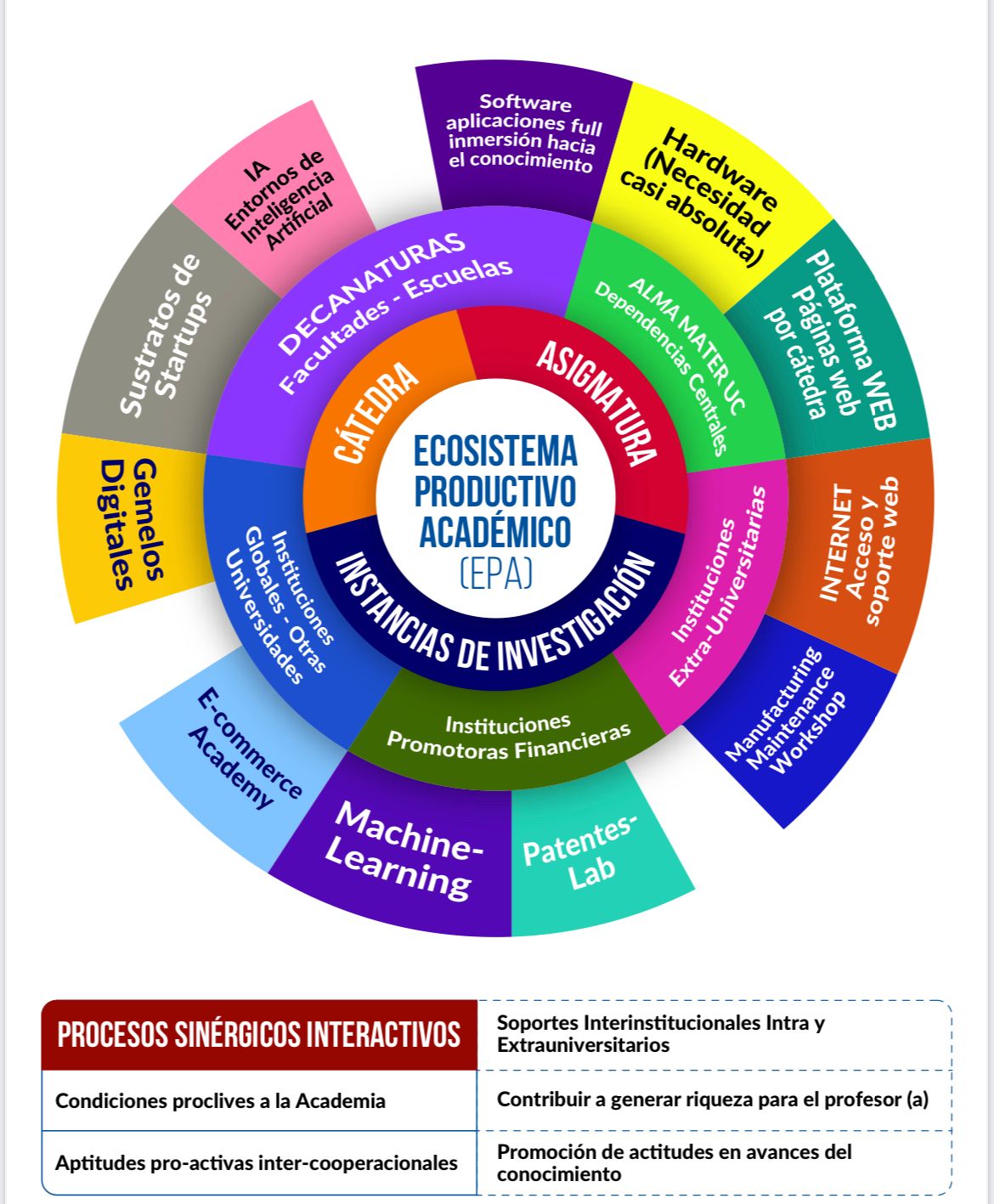 El Ecosistema Productivo Académico (EPA) define a la cátedra y/o asignatura como la unidad básica para promover redes versátiles de profesores(as), socios del instituto, conformados en equipos de mixtura multigeneracional (fourth and fifth level), interdisciplinarios y transdisciplinares, configurando un modelo sinérgico de círculo virtuoso, para intentar poner en marcha muchas de las ideas y proyectos de nuestro profesorado. Estimular, desde el IPAPEDI, a través de la convocatoria amplia y universal de ayudas para la cátedra y/o asignaturas, aquellos proyectos que, entre otros, apuesten a ser pertinentes, disruptivos, de alto impacto en tiempo de crisis, como por ejemplo, sistemas patentados de aceleradores de startups o los “talleres” de gemelos digitales para productos tecnológicos utilitarios o procesos correctivos de problemáticas en ciudades y territorios así como la reactivación de industrias del siglo XXI (machine learning) para que, a partir de la representación física de activos, procesos y sistemas, la analítica de los datos y hasta el uso de algoritmos de inteligencia artificial (IA), se creen modelos simulados del comportamiento de los servicios de primera necesidad de las sociedades y que favorezcan la toma de decisiones en tiempo real y a largo plazo.