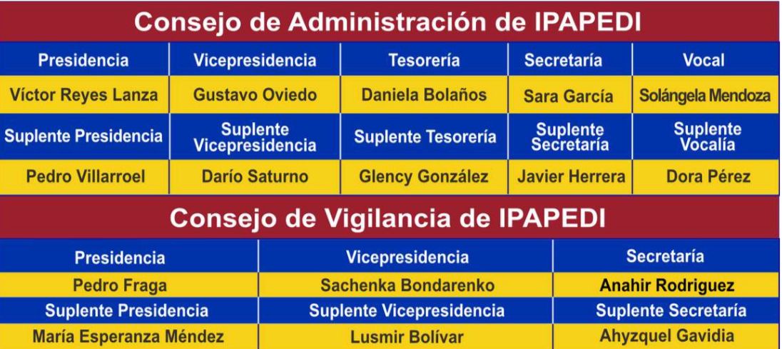 Al Consejo de Administración de IPAPEDI: Presidencia: Víctor Reyes Lanza; Presidencia suplencia: Pedro Villarroel; Vicepresidencia: Gustavo Oviedo; Vicepresidencia suplencia: Darío Saturno; Tesorería: Daniela Bolaños; Tesorería suplencia: Glency González; Secretaría: Sara García; Secretaría suplencia: Javier Herrera; Vocalía: Solángela Mendoza; Vocalía suplencia: Dora Pérez.