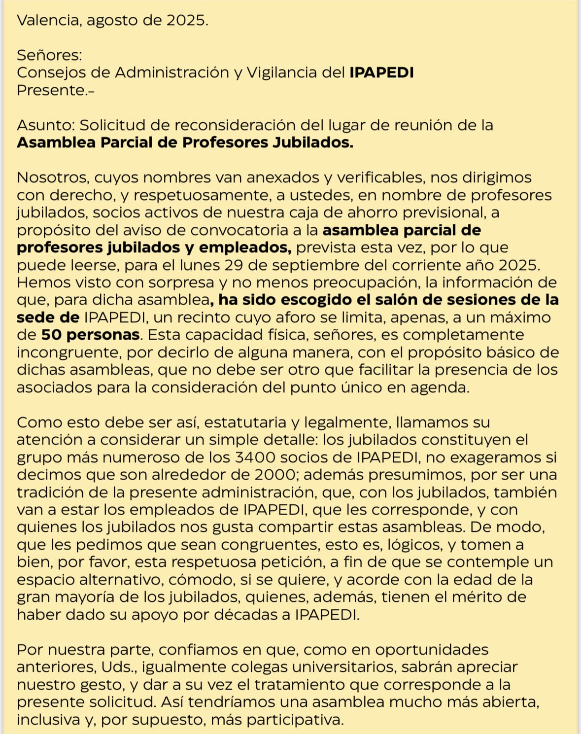 La crónica de hoy, primer domingo de agosto de 2025 la dedico a copiar y pegar una comunicación que con el debido comedimiento y respeto, más de doscientos cincuenta (250) profesores Jubilados de la UC harán llegar a los Consejos de Administración y Vigilancia del IPAPEDI, a los fines de que tengan a bien, reconsiderar y reprogramar el lugar en el que se llevará a cabo la asamblea parcial de jubilados y empleados, cuyo propósito es elegir la comisión electoral que regirá el proceso de elección de las nuevas autoridades para el periodo 2025-2028. Anexo lo indicado.