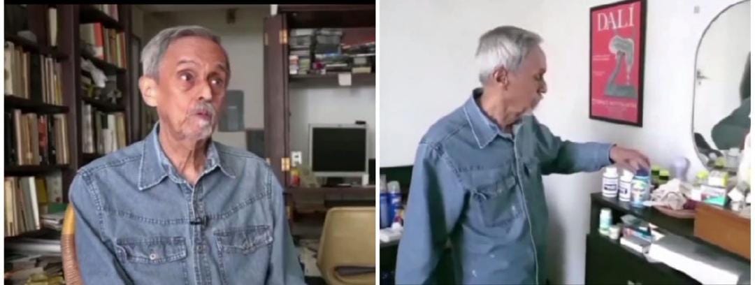 El testimonio del profesor Carlos Torres deja en claro la calamidad existencial que embarga a la mayoría del estamento profesoral universitario. En la composición gráfica de la presente crónica, a la izquierda y en el fondo se percibe la silente biblioteca del profesor Torres, que durante 40 años alimentó su sapiencia en materia de Economía. En la foto de la derecha, se aprecia al profesor hurgando y buscando, entre muchos medicamentos, el que, tal vez, le corresponde consumir a hora determinada, y haciendo votos porque no se le haya agotado.