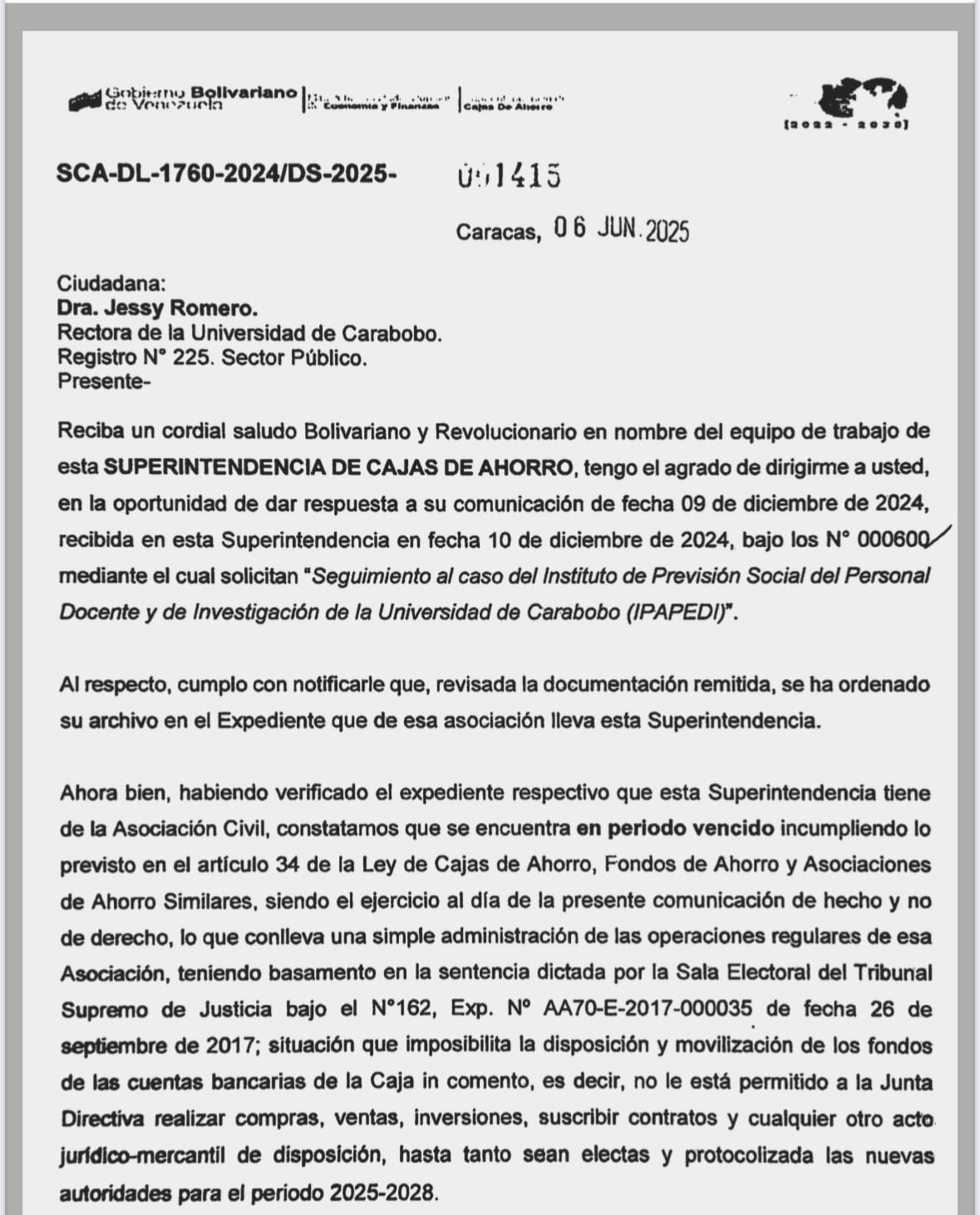 La expresión latina ¡re et non iure!, en español: “de hecho y no de derecho”, me sirve para la crónica de hoy, a la que intitulo con dicha expresión. Más abajo, he decidido copiar y pegar la comunicación emanada del Sr. Joel José Gonzalez Avilan, Superintendente de Cajas de Ahorro, fechada 06 junio de 2025, y dirigida a la rectora magnífica de la Universidad de Carabobo, Dra. Jessy Divo de Romero.