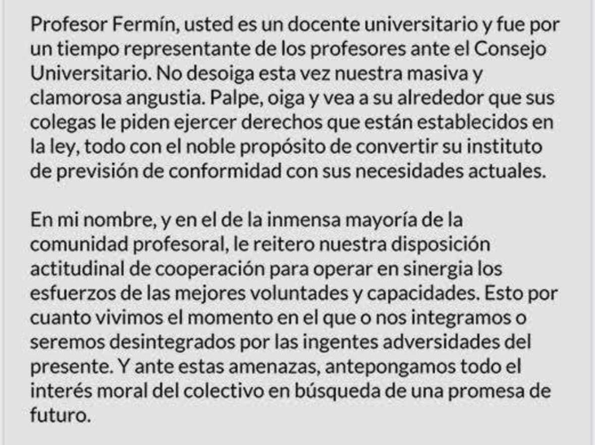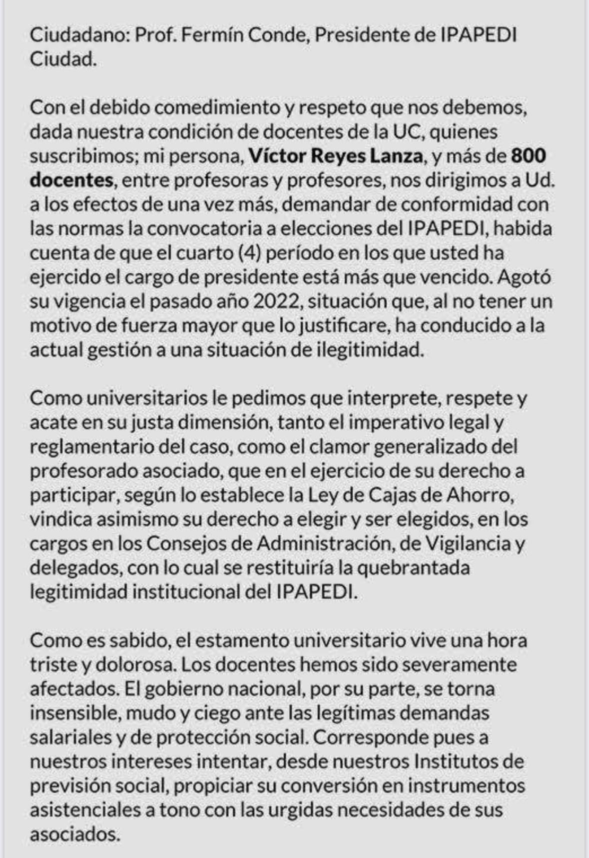 Profesor(a), el 19 de junio pasado se cumplieron tres (3) años de haberse vencido el período que, estatutaria y legalmente, está establecido para las gestiones del Ipapedi. Nunca hubo respuesta a la citada misiva y lo más escandaloso: tampoco se ha convocado el proceso electoral. El domingo próximo pasado hice saber, y lo reitero hoy, que antes del receso vacacional previsto a partir de los primeros días de agosto, vamos a convocar la más grande y entusiasta asamblea de profesores UCistas jamás habida en estos últimos años en nuestra Alma Mater. IPAPEDI: Somos 3300 profesores. Estamos en la etapa de la organización y, con la antelación del caso, daremos a conocer el sitio, fecha y hora donde habremos de encontrarnos de frente con la verdad de nuestro destino.