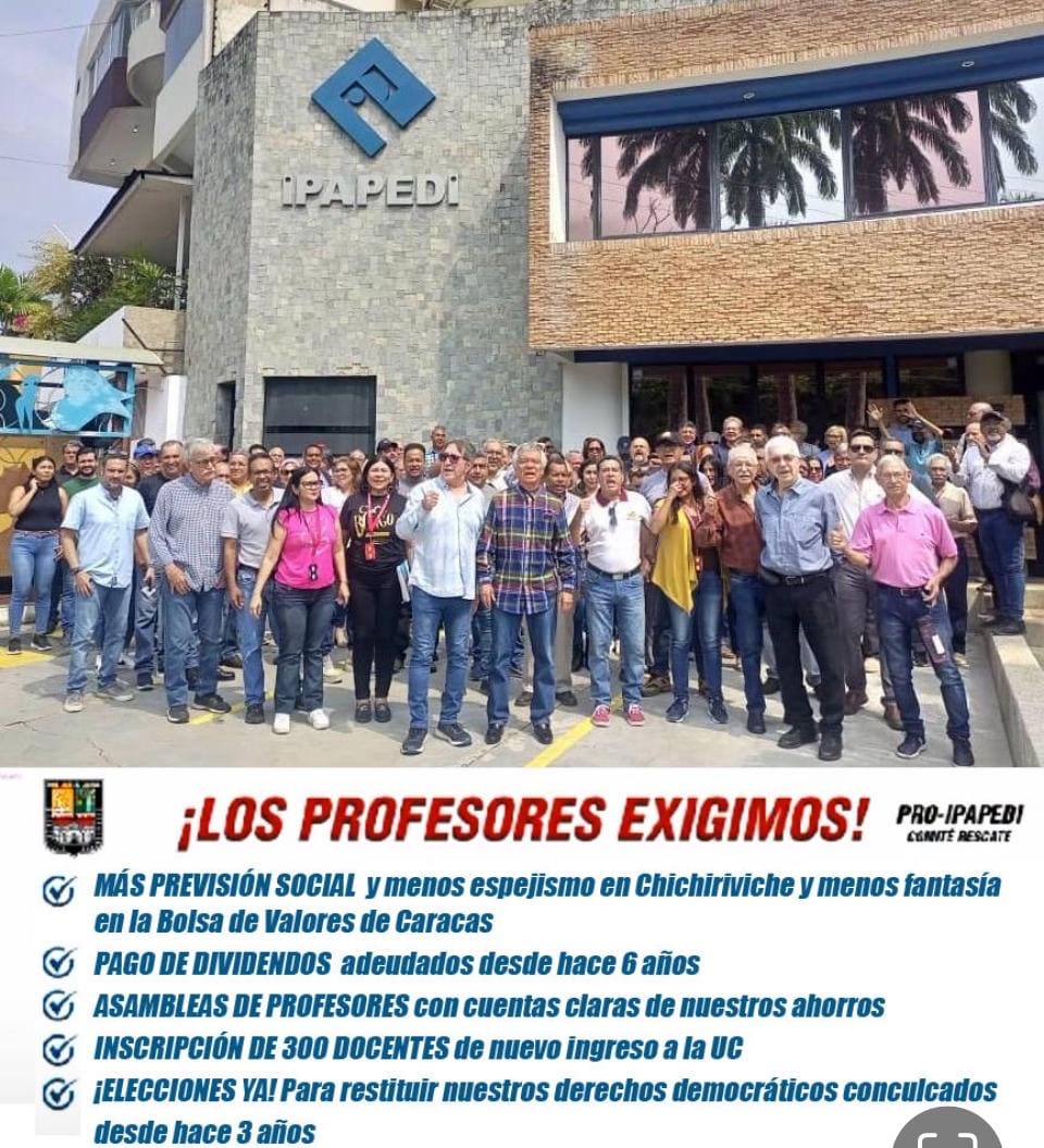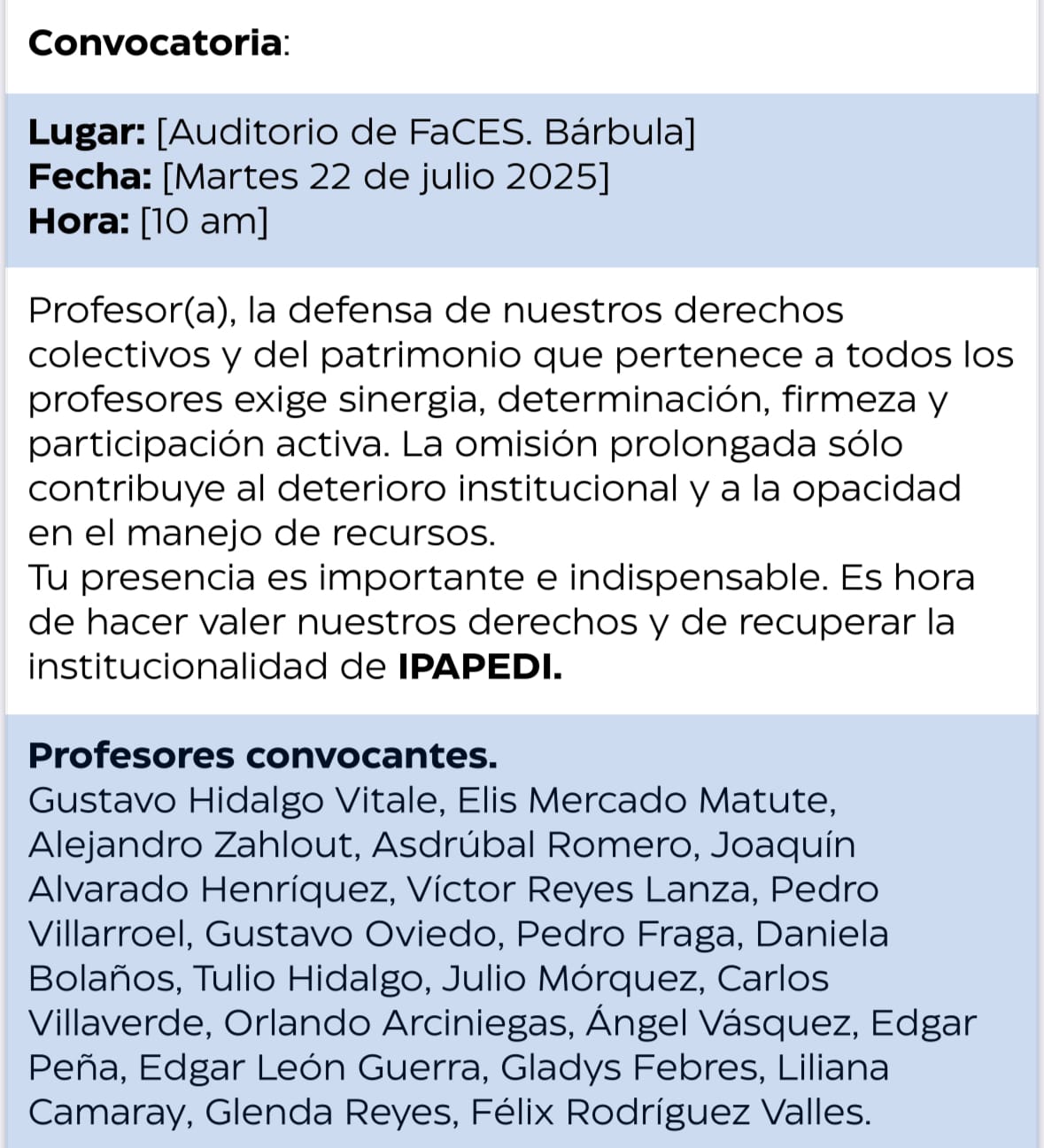 La crónica de hoy domingo tiene el propósito de hacer saber a la comunidad universitaria UCista, y, en particular, al estamento profesoral, que quienes, por ser profesores ordinarios activos y jubilados, asociados al instituto de previsión y ahorro IPAPEDI, que llevamos más de tres (3) largos años de haber abrazado la causa del recate del instituto del desvarío y extravío en el que está sumido, hemos igualmente considerado necesario convocar a los colegas a una asamblea de profesores asociados al IPAPEDI.